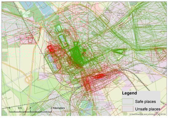 Additionally, since attributes of the respondents’ sex was also given in our dataset, an obvious possibility was to test, whether any differences exist between male or female drawn maps, namely between the two group’s local perception of fear or safety. Figure 3 was created by comparing the number of male or female respondents, who marked a territory safe or unsafe in one of our analyzed cities. This representative result shows pale differences between male and female respondents’ judgment of places, suggesting that fear of crime is better explained by space rather than gender.