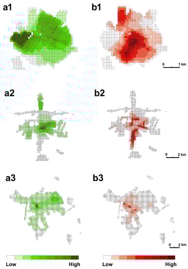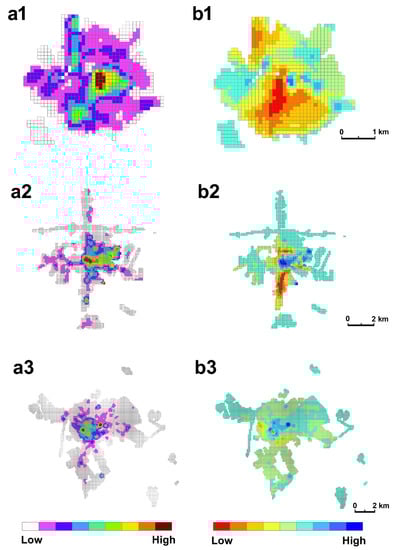 As mentioned above, digital sketch map polygons drawn by the users were overlapped and aggregated in each city to a 100 × 100 m grid. The value of the grid cells, consequently, represented the total number of the counted polygons normalized in reference to the maximum observed value in each city. It was expected that the normalized values of the grids vary significantly in different areas of the observed cities, in line with that, result maps reflected certainly not random but structured spatial pattern of values. Distribution maps of places marked as safe or unsafe have been created for each of the nine cities, and the results of three of them (a small, a medium and a large city) are presented on map series of Figure 2.