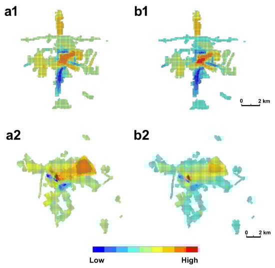 Local differences of place judgment: (a) local counts of marking a place safe minus local counts of marking it unsafe; (b) normalized number of marking a place safe minus normalized number of marking it unsafe. Higher values indicate safer, lower values indicate more unsafe perception. Example city: (1) Nagykanizsa, (2) Székesfehérvár.