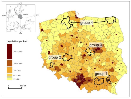| 4. | Very low population density area—41.98 people per km2 | Bytowski, Chojnicki, Gołdapski, Olecki, Suwalski |