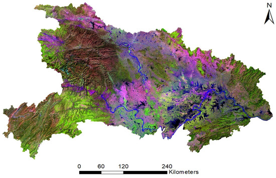 Land cover data are derived from Landsat TM remote sensing images (the synthesized remote sensing image is shown in Figure 2) downloaded from the geographic cloud [47], which are interpreted manually and visually. Land cover classification data on the resources and environment database technology standard classifications are divided into cultivated land, forest land, grassland, water area, construction land and unused land, obtained in 2000, 2005, 2010 and 2015, creating four sets of land cover data. All data are classified as level 1 class data precision to accord with the ‘strategic leading science and technology projects of the Chinese Academy of Sciences’, requiring accuracy of more than 90%. Baidu is the largest Internet search engine in China, and the BDI is calculated based on the search data of netizens, reflecting people’s behaviors [48].
