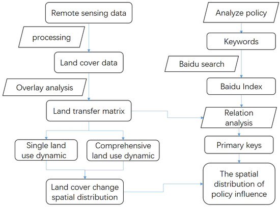 The search index is based on the data of people’s search volume in Baidu and takes keywords as the statistical object to scientifically analyze and calculate the weighted sum of search frequency of each keyword in the Baidu web search. The BDI is a search index of a large number of internet users downloaded from the Baidu website, and the number of internet users increased by 3.7% from 2014 to 2015. By 2015, the internet penetration rate had reached 46.8% in Hubei Province [51], which means that one out of every two people could access the Internet. As the Internet has reached a certain amount of coverage in China, government policies are released through the Internet, and internet users can also search the web to find relevant policies. Therefore, the behavior of netizens reflects the degree of their concern for policies, and the driving force behind the occurrence of a large number of such concerns may be the effect of policies, corresponding to the consistent changes in land cover changes. Therefore, we studied the relationship between the BDI and land cover change to further explore the relationship between land cover change and policy. Our data processing procedure is as follows: (1) use remote sensing data to obtain land use data of the corresponding time through visual interpretation; (2) collect relevant policies according to a certain type of land cover and extract a series of keywords; (3) search the keyword with the search engine, and download the corresponding data. The Baidu index data is based on the content of the Baidu search engine search data volume, and the number of Internet users who have searched various pages, weighted sum. It is not a direct search volume—it is a number obtained by the weighted sum of search volume and can reflect the concerns and needs of Internet users. This value is zero or positive with no range requirements. The greater the people’s attention, the greater the impact. It can carry to the statistics according to the space area and the time scope; (4) the correlation analysis of the Baidu index and land cover change data is carried out to determine influential keywords; (5) the influence value can be obtained by substituting the BDI and land cover data of these keywords into formula (3). We selected representative keywords for policy, retrieved its BDI and identified the corresponding degree and type of land cover change that occurred due to public attention. The records from 2010 to 2015 contained all the required keyword search data, which fully reflected relevant situations. Therefore, the search keywords from 2010 to 2015 were selected. As the BDI follows a non-normal distribution, and we sought to find a relationship between keywords in the BDI and land cover change, we used Spearman’s rank correlation coefficient test to identify the correlation between the two. We constructed the index quantity as shown in Formula (3). Finally, we selected cultivated land and construction land, which may be affected by policy, for spatial analysis. A flow chart of the complete data processing method is shown in Figure 3.