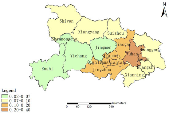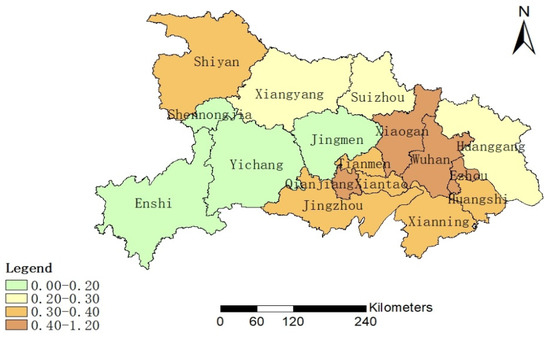 As mobile phone data obtained from the BDI from 2010 to 2015 are relatively comprehensive, the corresponding dynamic attitude of comprehensive land use in each region of Hubei Province during this period was studied. Specifically, the dynamic attitude of comprehensive land use in Hubei Province is shown in Figure 4. On the whole, the dynamic attitude of land use in the areas near Wuhan is relatively large, while the comprehensive land use in the areas far away from Wuhan is relatively small. The dynamic attitude of comprehensive land use in Wuhan and Ezhou is 0.28 and 0.32, respectively. The degrees of comprehensive land use in Xiaogan, Jingzhou and Qianjiang are 0.17, 0.14 and 0.16, respectively. Enshi Tujia and Miao Autonomous Prefecture, Shennongjia Forest District and Yichang city were lower, at 0.02, 0.02 and 0.05. The comprehensive land use change in other areas was higher than that in Tujia and Miao Autonomous Prefecture, but lower than that in Xiaogan.