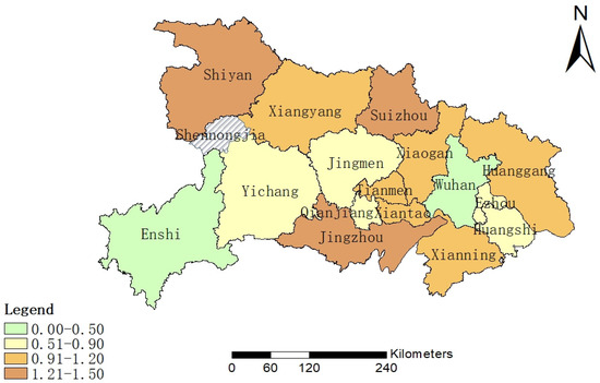 In addition to the impact of public attention on arable land, we also studied the impact of policies on construction land. See Figure 8 for the distribution map of the impact of policies on various regions. In the diagram, Jingzhou city is the most significant area affected by policies, followed by Shiyan and Suizhou with values of 1.48, 1.33 and 2.23, respectively. Tianmen city, Xiantao city, Xiaogan, Xianning city and Huanggang city, Xiangyang city had values of 1.05, 0.85, 1.29, 0.96, 1.08 and 1.00, respectively, while Enshi Tujia and Miao Autonomous Prefecture had the lowest values with 0.44 and 0.22, Yichang, Jingmen, Qianjiang, Ezhou and Huanggang sat in the middle of the above two areas. The Shennongjia forest region, as a protected forest area, saw a search volume of zero and was not considered. On the whole, there are more concentrated areas around Wuhan. Compared with Figure 5, the overall impact is greater than that of cultivated land.