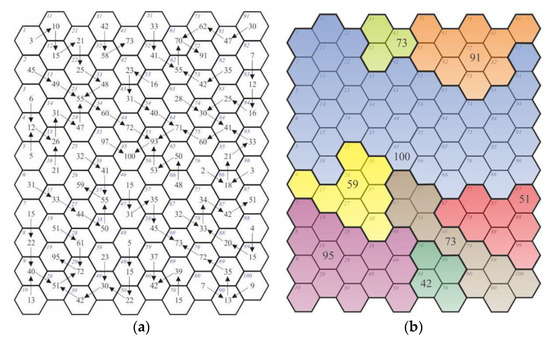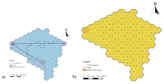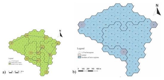 In order to develop network models, a network of basic fields of assessment was constructed, in which each field had a test value which represented a phenomenon. A definition of the basic field was described by Hopfer, Cymerman, and Nowak [46] as well as Bajerowski et al. [47]. Sanetra and Cieślak [48] and Lechnio [49] also wrote extensively about the theory of basic fields. For the purpose of analysis, hexagonal basic fields (Figure 1) used in cartographic modeling and cartographic presentation of spatial data (hexbin map) were applied [50].