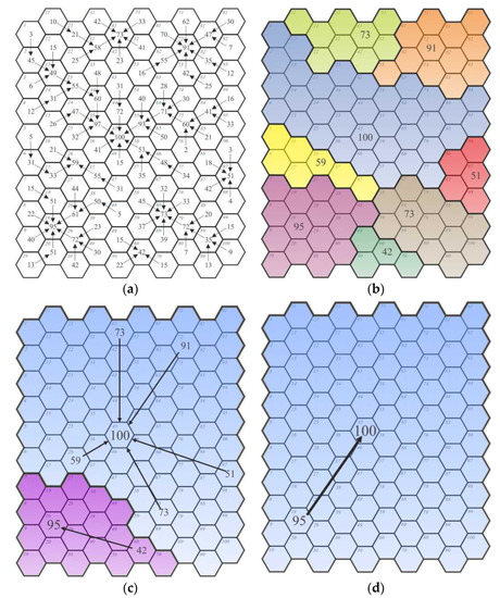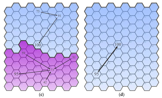 Connections in this network were generated based on the same principles as those previously described (i.e., to the neighboring field but according to the minimum value decrease principle). The stage of revealing relationships showed that for 84 fields (nodes; Figure 3a), the value decreases minimally and thus forms connections. Therefore, according to this path, stage 1 of aggregation enabled the emergence of 16 new regions (Figure 3b). In the next step of the model development, new regions (and their boundaries) were regarded as new nodes in the network, represented by the leading node’s value (definition in Section 2.1.1, p. 5). The values were combined in this way until the possibilities for a connection were exhausted (i.e., until the values could not be differentiated).