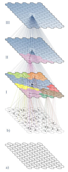As regards this model, each field searched for a connection according to the maximum value decrease path. In this case, similar to Section 2.1.3, a hierarchical network model with modular structure elements was obtained as well. The network model comprises three stages of aggregation (Figure 4).