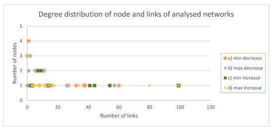 The distribution of nodes and links in the developed network structures. Key: Network models developed according to the paths of (a) minimum value decrease; (b) maximum value decrease; (c) minimum value increase; (d) maximum value increase. Source: Own analysis.