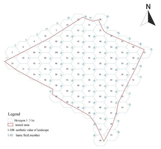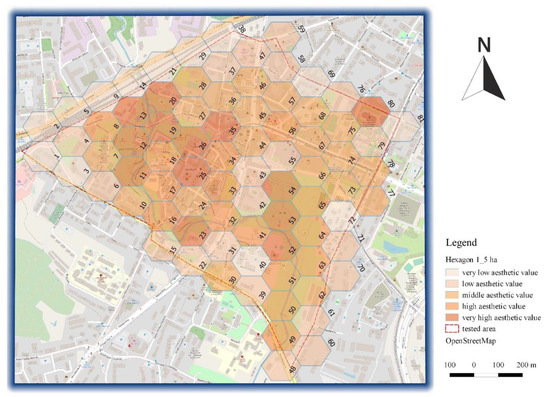Step 3. Determination of values representing individual basic fields of assessment: each hexagon presented in Figure 9 has its own number and an estimated aesthetic value of the landscape (the number provided in the central part of each field, on a scale ranging from 5 to 100). The values were estimated using the Wejchert method [47] and the filling in of an urban landscape assessment sheet.