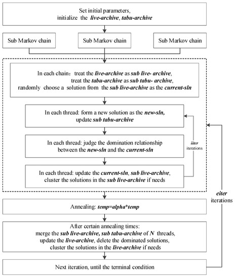 Based on multiple Markov chains, the multi-core parallelization technology is employed in AMOSA-II to improve optimization efficiency. With the rapid development of computer science, multi-core parallelization technology has shown great computational performance [46,47]. With this technology, the main task is divided into several sub-tasks that are allocated to multiple processors as certain patterns. These processors can be the cores from the same or different computers. Then, these sub-tasks are executed independently and synchronously, the implementation process of each sub-task does not depend on those of the others. When all sub-tasks are completed, the results of all sub-tasks are collected on the basis of certain mechanisms and output as the integrated result of the main task. A single Markov chain is a serializable process that cannot be decomposed into parallel sub-tasks. For multiple Markov chains, each one iterates independently, and the iterative results must be combined after certain iterations. Therefore, the multi-core parallelization technology can be applied to multiple Markov chains, which decomposes the entire process into parallel sub-tasks to iterate synchronously with the aim of improving efficiency.