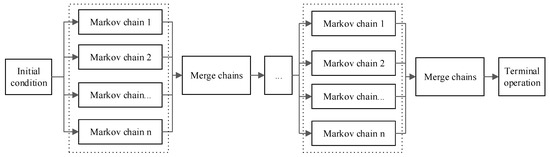 Multiple Markov chains are separated from one simulated annealing chain, and they cannot only grow independently—that is, simultaneously or asynchronously—but also share information at certain moments [45]. It becomes feasible for them to parallelize with the multi-core technology in the optimization process. Multiple Markov chains obtain the optimal solutions through their own iterations, which greatly extends the search scale compared to one single Markov chain. When the combination condition is satisfied, the optimal solutions from all chains are compared, and the most optimal solutions are obtained and treated as the input of the next iteration stage for all chains. The convergence is sped up by the information interaction. Thus, optimization efficiency is improved as a result of multiple Markov chains.