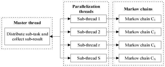 The sketch of parallelization based on multiple Markov chains is presented Figure 3. Based on a high-performance computer configured with multiple cores, the main thread first must apply for S sub-threads, and then decompose the entire iterative task based on multiple Markov chains into multiple sub-tasks. These sub-tasks are dynamically distributed to the sub-threads and each sub-thread is ensured to have one sub-task. Once one sub-task of a sub-thread is completed and then another sub-task is called in. As all sub-threads complete all sub-tasks, the results of all sub-tasks are collected by the main thread and treated as the output of the entire iterative task.