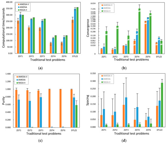 In addition, the respective SD indices for each algorithm, which is represented by the error line of the bar graph in the Figure 4, is analyzed. The SD of computational time for AMOSA-II is comparable with AMOSA, but higher than NSGA-II, which implies that the computational time for AMOSA-II is not as stable as that for NSGA-II. This is partially because the number of searched optimal solutions changes in each iteration for AMOSA-II and AMOSA. Based on the varying number of solutions, the amount of judging operating is varying and the time for clustering operation is also not guaranteed to be stable. However, for NSGA-II, the number of solutions is fixed in each generation which makes it much more stable in terms of computational time. The SD indices of convergence, purity, and displacement for AMOSA-II is lower than those of AMOSA and NSGA-II, which implies that the quality of optimal solutions is more stable. The SD indices of spacing and min-spacing for three algorithms is fluctuant, which implies that the uniform distribution of optimal solutions is not stable.