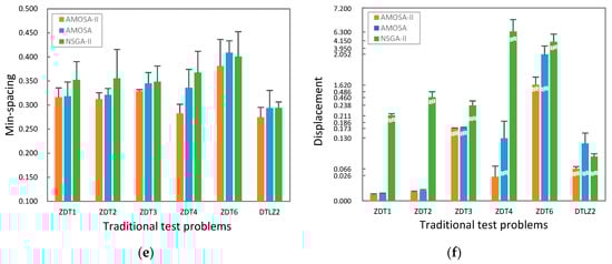 Performance indices of AMOSA-II, AMOSA, and NSGA-II with traditional test problems (ZDT1, ZDT2, ZDT3, ZDT4, ZDT6, and DTLZ2): (a) computational time; (b) convergence; (c) purity; (d) spacing; (e) min-spacing; (f) displacement.