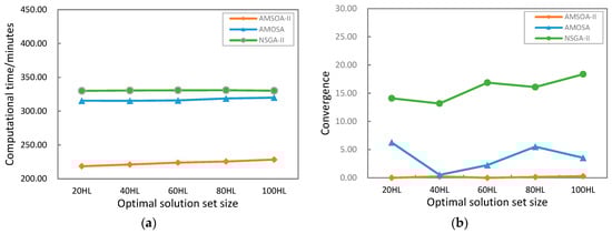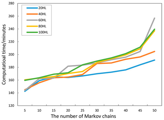 First, the effect of the number of Markov chains on the algorithm efficiency is analyzed on the basis of experiment A. As depicted in Figure 7, the running time gradually increased from 150 min to approximately 220 min as the number of Markov chains increased, which implies that more chains increase the running time. In addition, more chains also imply more intensive search for optimal solutions, and fewer chains means possible insufficient search, which may affect the performance of optimal solutions. However, an excessive number of chains can result in extraordinary running time, which is unacceptable for providing optimal solutions within required time; thus, the number of Markov chains must be suitable in terms of the acceptable operation time and the quality of optimal solutions.