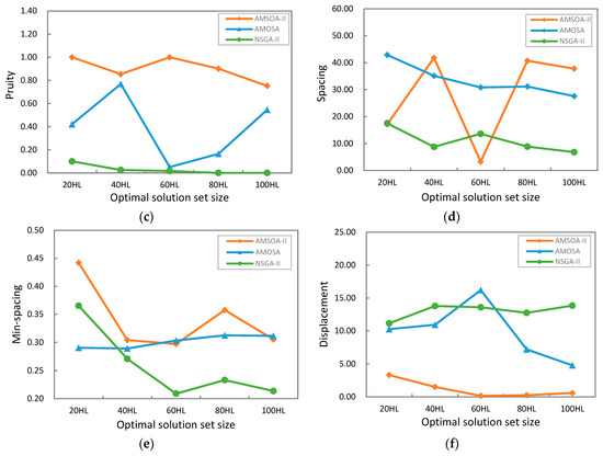 Performance indices of AMOSA-II, AMOSA, and NSGA-II with the optimal solution set size (20HL, 40HL, 60HL, 80HL, and 100HL): (a) computational time; (b) convergence; (c) purity; (d) spacing; (e) min-spacing; (f) displacement.
