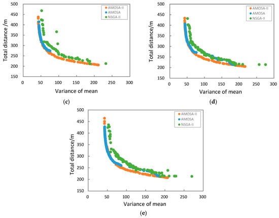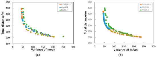 Based on the optimization result obtained with AMOSA-II, AMOSA, and NSGA-II, the spreading of their optimal solutions is presented in Figure 6. The results reveal that the optimal solutions from AMOSA-II denominate more solutions than those of AMOSA and NSGA-II, which implies that the optimal solutions of AMOSA-II are more convergent. The spreading of the optimal solution set obtained with AMOSA-II is relatively more uniform, while the optimal solutions obtained with AMOSA and NSGA-II algorithms are relatively more unevenly spread. This is inconsistent with the above results of the spacing and min-spacing indices, and it further supports the argument that the two indices do not accurately describe the distribution uniformity of the solution set, which is declared by Bandyopadhyay [16]. In conclusion, the optimization of soil multi-objective sampling with AMOSA-II is improved not only for the computational efficiency, but also for the convergence and uniformity of the optimal solution set.