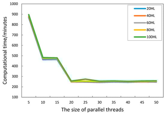 Next, the influence of different parallelization cores on algorithm efficiency is analyzed based on the experiment B. As depicted in Figure 8, with the number of cores increasing, the running time decreased from initial 900 min (5 cores) to 280 min (20 cores), and then remained stable. In this case, just 20 cores for parallelization can take full advantage of the computer with 56 cores, and there is no need to parallelize all the computer cores. On the contrary, taking up more unnecessary cores implies less cores for other tasks, wastage of computational resources, and sacrificing the efficiency of other tasks. Therefore, the number of parallelization kernels must be more than half of the computer’s configuration, which not only guarantees the running efficiency but also saves the computing space.
