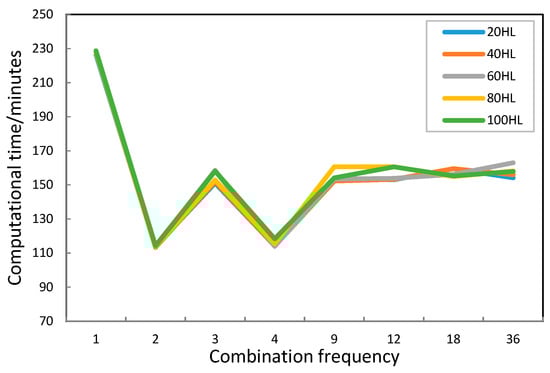Moreover, the effect of different combination frequencies on algorithm efficiency is discussed based on experiment C. As illustrated in Figure 9, the running time decreased from 230 min initially to approximately 160 min after fluctuation, and then remained stable while the combination frequency increased. The result implies that a higher combination frequency leads to greater efficiency. However, an excessively high combination frequency may result in bad convergence performance of the optimal solutions, because each chain does not iterate enough times before combined, and then the convergence of obtained optimal solutions becomes insufficient. As such, the demand for the performance of optimal solutions and the acceptable running time must be considered together to set the combination frequency.