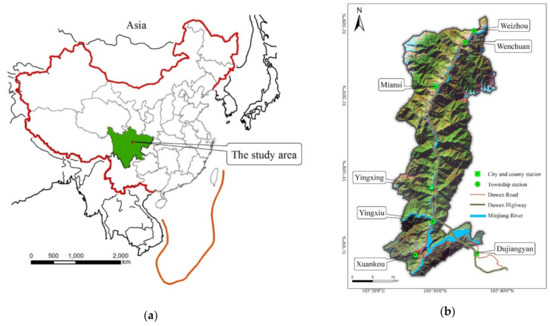 (a) Location of the study area, Sichuan Province, China; (b) remote sensing image map of Dujiangyan-Wenchuan Road.