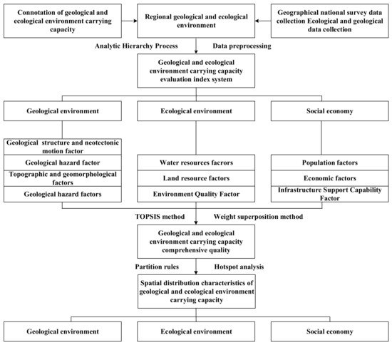 First, research on the bearing capacity constructs the evaluation research framework of the geological ecological environment bearing capacity. Then, the regional bearing capacity status evaluation index system is constructed, which includes three target levels of environment, geologic environment, ecological environment, and social economy, according to the first national geographical survey data of Sichuan Province. It is divided into several evaluation indicators. GIS and Remote Sensing technology are applied to preprocess the data of evaluation indicators, quantify each index factor, and divide the quantified results into five grades. AHP is then used to calculate and assign weights to each indicator. Finally, the TOPSIS method is used to calculate the comprehensive index of geological and ecological environmental bearing capacity of the study area through weighted superposition. The zoning rules, high-value clustering area, low-valued aggregation area, and no significant point area, are used to classify the bearing capacity of the study area through weighted superposition. Thus, the bearing capacity of the study area is comprehensively evaluated, the spatial agglomeration characteristics of the bearing capacity is analyzed, the temporal and spatial distribution of the bearing capacity of the study area is explored, and the priority area of the bearing capacity is delineated. The Overall Methodological Framework is shown as Figure 2.