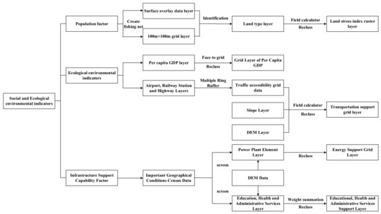 According to the established index system, we referenced some of the index classification standards adopted in relevant home and abroad studies, including GB50218-2014, HJ192-2015, GB50188-2007 [29,30,31]. Wang et al. [32] researched the bearing capacity of geological and ecological environment. The index layer is quantified by ArcGIS software, and the quantitative results are divided into five levels, with scores of 1, 2, 3, 4, and 5 respectively. The higher the score, the better the bearing capacity index. Otherwise, the worse the bearing capacity index will be. The data processing flow of index factors is shown in Figure 3, Figure 4, and Figure 5.