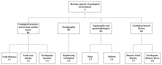 In the hierarchical structure chart of geo-environmental bearing capacity evaluation (Figure 6), the geological environment bearing capacity is the target layer (layer A) of the hierarchical structure. The structural elements, geomorphic elements, and other elements are the criteria layer (layer B). The specific slope, high-rise, seismic intensity, and other eight indicators are the indicator layer (layer C) of the hierarchical level.
