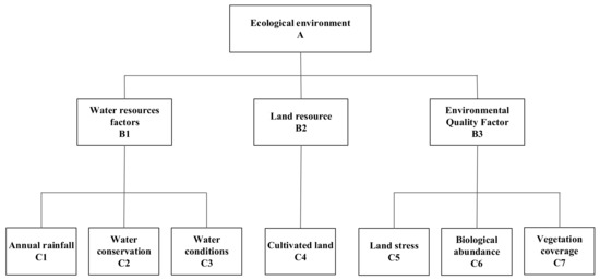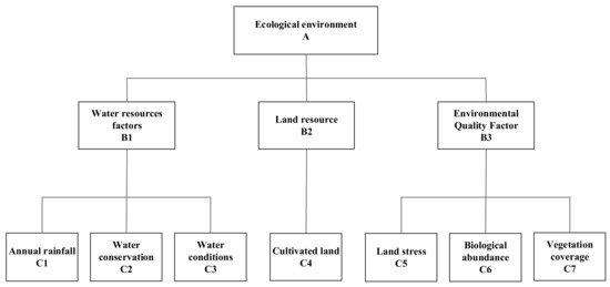 In the hierarchical structure chart of eco-environmental bearing capacity evaluation (Figure 7), eco-environmental bearing capacity is the target layer (Layer A) of hierarchical structure, water resource elements, land resource elements, and other elements are the criteria layer (Layer B). Seven indicators, such as annual rainfall, water conservation, and cultivated land conditions are the indicator layer (Layer C) of hierarchical structure.