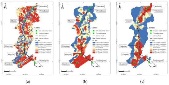 (a) Results of hotspot analysis: for hot spot analysis of geological environment subsystem; (b) hot spot analysis of ecological environment subsystem; (c) hotspot analysis of social economic subsystem.