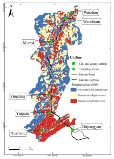 The bearing capacity of geological and ecological environment along Du-Wen Road has distinctive spatial clustering characteristics. In general, the bearing capacity of Xuankou Town and Yingxiu Town along the main stream of Minjiang River in the south is better than that of Weizhou Town and Miansi Town in the north. The bearing capacity is obviously low in the vicinity of faults and where debris flow, landslide, and other geological disasters have happened. Among them: the total area suitable for construction is 288.38 km2, accounting for 31.12% of the total area of the region; the total area of the reserve development area is 296.35 km2, accounting for 31.98% of the total area of the region; the total area unsuitable for construction area is 340.87 km2, accounting for 36.79% of the total area of the region.