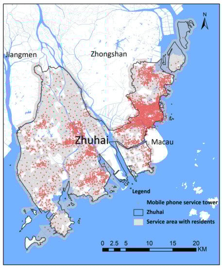 China Mobile Communications Group Co., Ltd. (CMCC) is the largest communication service provider in China. Mobile phone data records the location of each phone user (represented as the connected service tower location) in a time interval when a mobile phone was being used every day in April 2016. The mobile phone data includes user ID, the timestamp and the ID of service tower where the phone connects to. This dataset consists of 3363 service towers in total in Zhuhai (Figure 1). All the signals are recorded in the dataset despite the types (such as 2G, 3G, or/and 4G). If the connection distance of the service tower is not different and there is no terrain fluctuation, the mobile phone will connect to the nearest service tower. In Thiessen polygons, the nearest center of each point always belongs to the polygon where the point is located. Because of this characteristic, creating Thiessen polygons can make location information more accurate and has been a widely used division method when working with mobile phone data [,]. In order to protect users’ privacy, no personal information, such as phone number, user’s name, and identity number, is accessible during all the data processing procedures, and the location data is aggregated into the spatial unit that shaped by creating the Thiessen polygons.