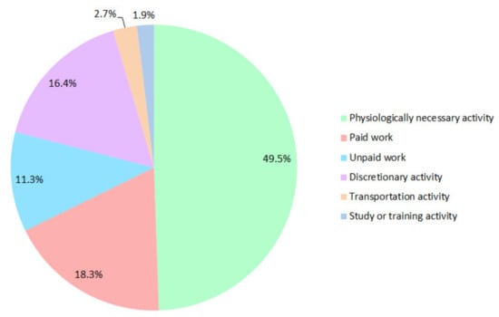 In the time geography theory, activity space is determined not only by spatial dimension, but also the time allocation []. According to The 2018 National Time Utilization Survey [], the statistical result of residents’ time allocation is revealed and is just as shown in Figure 2 []. The time of physiologically necessary activity (including sleeping, personal health nursing, dining, etc.) accounted for 49.5% of residents’ time. Paid work and unpaid work together possessed 29.6% of residents’ time. The remaining time possession is mainly for discretionary activities (16.4%), such as taking leisure or social interaction activities in places like shopping malls (public service places) or cinema (entertainment place). Transportation and study cost too little time to be the main activity; therefore, these two types of activity and working activity are combined together as commuting activity in this study.