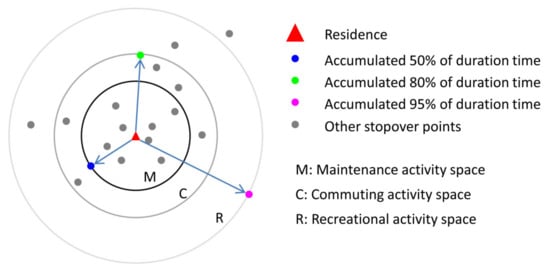 We extract the main stopover point every half an hour from the mobile phone data of residents in data preprocessing. In order to identify the space for three types of activity, the resident’s main stopover points in a period of time are arranged according to the distance to the residence, where the time duration at each point is equal, as shown in Figure 3. After accumulating the interval between adjacent spatio-temporal points in the distance ascending order, stopover points corresponding to 50%, 80% and 95% duration time can be extracted. As we mentioned earlier, a certain type of activity space is a certain area where residents spend corresponding time in their daily lives. According to the time ratio definition for three activity spaces in this study, the three stopover points extracted can represent the furthest location that residents have reached to complete three types of activities. For example, the maintenance activity space is made by the radius from residence to the blue point in Figure 3. In this research, the distance from stopover points extracted to the residence for each resident represents the scale of activity space.