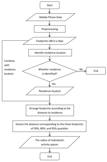 In order to obtain the scope of activity space, the resident’s footprints are listed according to the distance between footprints and residence according to the ascending order of the distance value. Thus, three footprints of 50%, 80% and 95% quantiles are extracted in the order. The distances between the three footprints and residence represent the radii of maintenance activity space, commuting activity space, and recreational activity space respectively from the residence. All three ranges compose the scope of activity space in this paper. The complete identification process of individuals’ activity space is shown in Figure 4. Since urban residents living in the same mobile phone tower service area share the same residence area, the residents’ activity space radius is the average of the radius of all the residents’ activity space in this service area.