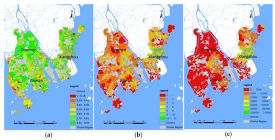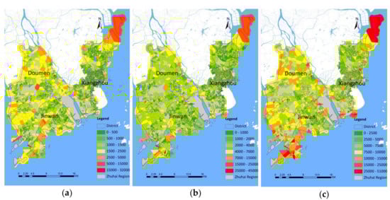 As shown in Figure 5a, the radius of maintenance activity space is less than 2500 meters in most areas. Residents of Xiangzhou District, the core area of Zhuhai, mainly live in the maintenance activity space that is below 1000 meters, and only the northeast of this district has a larger activity space. The radius of maintenance activity space in Doumen District and Jinwan District is mainly between 1000 meters and 2500 meters, but a few of them are lower or higher than this range. In commuting activity space shown in Figure 5b, the radius of commuting activity space in Xiangzhou District is mainly within 2000 meters and still better than another two. The distributions of the radius of commuting activity space in Doumen District and Jinwan District are similar. Most areas of the two districts have the radius of commuting activity space between 2000 meters and 4000 meters. And in recreational activity space, the difference of the radius is dramatic, just as shown in Figure 5c. In Xiangzhou District, recreational activities can be satisfied within 5000 meters normally. But in Doumen District and Jinwan District, more than half of areas need to travel more than 7500 meters to complete recreational activities. And only a few central areas of the two districts have the radius of recreational activities like Xiangzhou District.