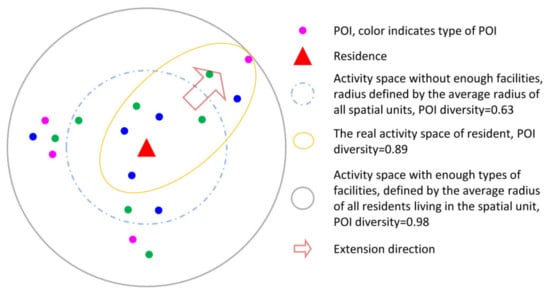 As a result, the positive related relationship between POI diversity and the size of activity space was much different from existing research. This is mainly owed to the varying size of the activity space defined by the average radius of the activity spaces of all residents living in the spatial unit. When sizes of the spatial units are the same or similar, a low diversity will lead to a long travel distance because residents tend to find more facilities to fulfill the daily life, which has been verified by a large amount of existing research []. In this paper, the ranges of the spatial units (activity space in this research) depend on the average radius of activities and the built environment indexes are measured on the spatial units with varying radius. In this way, the range of activity space is consistent with that of built environment. Therefore, residents in a fixed range and low diversity area will tend to extend the activity space to find more types of facilities to fulfill the various requirements in daily life. Another reason leading to the positive relationship between POI-based diversity and activity radius is the directionality of residents’ activity. Yuan and Raubal have proved that the directionality of residents’ daily life []. When residents tend to find more facilities in one direction in a broader range, the amount and types of POIs will quickly increase and lead to the positive relationship between POI diversity and size of activity space (Figure 7).