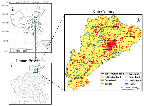 To verify the feasibility of the model, we selected Xun County as the research area. The study area (35°26′00″ ~ 35°50′42″N, 114°14′52″ ~ 114°45′12″E) is located in northern Henan Province and eastern Hebi city and has an area of 954.98 km2 (Figure 1). The geographical location of Xun County is shown in Figure 1. The county has 9 townships, 476 villages, and 78,711.18 hectares of agricultural land, of which 70,994.60 hectares are arable land. The county’s overall topography is relatively flat—most of the areas are plains, and there are some hills and valleys in the west. Xun County has a provincial-level modern agricultural industrial park with an annual grain output of more than 1 million tons. It has been said since ancient times that “Li Yang harvest can take care of everyone”.