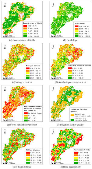 Spatial data of the main influencing factors in Xun County: (a) concentration of fields, (b) field slope, (c) nitrogen content, (d) available potassium content, (e) net forest and shelter forest, (f) irrigation facility quality, (g) tillage distance, and (h) road accessibility.