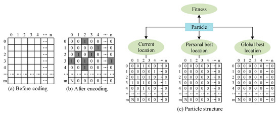 Particle coding strategy: (a) grid cells state before particle encoding; (b) grid cells state after particle encoding; (c) Particle structure.