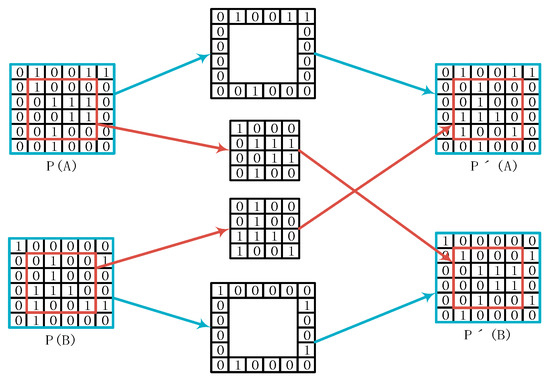 To ensure the diversity of particles and the generation of new antibodies, the model performed immune cross-operation on the two antibodies and combines the best retention strategies to obtain better antibodies. As shown in Figure 4, two parent antibodies are selected in the particle population: particle A (P (A) in Figure 4) and particle B (P (B) in Figure 4). Since it is a replacement operation of a certain area between two particles, the same area is randomly selected in the two particles, and cross-replacement is performed to obtain new particles, and . The fitness values of the parent antibody and the child antibody are calculated separately. If the fitness value of the hybridized child antibody is greater than the corresponding parent antibody, the corresponding parent antibody is replaced with the child antibody. Otherwise, it is not updated.