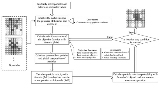 In recent years, artificial intelligence algorithms have had great advantages in solving multi-objective spatial planning problems and have been successfully applied in problems such as land resource allocation [28,29,30,31,32,33], spatial pattern optimization [34,35,36,37,38,39,40], space selection [41,42,43], and land use zoning [44,45,46,47]. Among the artificial intelligence algorithms, particle swarm optimization (PSO) is a swarm intelligence algorithm that is inspired by bird foraging activities. As an evolutionary algorithm, PSO has the advantages of better ability to solve complex problems, higher convergence speed, and lower problem dimension. It is very suitable for high-dimensional spatial optimization problems, has a fast convergence speed, and can solve multi-objective optimization problems in multiple fields. However, the particle swarm algorithm has the disadvantages of premature convergence and the possibility of sinking into the local optima of a basic PSO algorithm when solving the spatial optimization problem [48]. The artificial immune algorithm (AIA) simulates the biological immune process and can ensure the diversity of individuals, help improve the global convergence ability of the particle swarm algorithm, and prevent particles from falling into the local optimal solution.