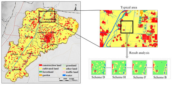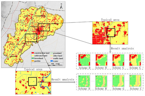 Two groups of typical areas were selected in the study area: the periphery of the town and the periphery of the main traffic road. Among these, the areas marked in pink are urban areas, and the areas marked in dark gray are road areas (shown in Figure 7). From the results of scheme D (with a stability weight of 0), scheme H (with a stability weight of 0.33), scheme G (with a stability weight of 0.5), and scheme C (with a stability weight of 0.8), it can be seen that when the stability weight values are small, the movement of the particle is more dependent on the quality of the land. At the same time, due to the limitation of urban boundaries, the selected farmland mostly gathered around cities and roads. As the weight of stability gradually increases, the selected area gradually moves away from the towns and roads, which has the effect of moving away from urban traffic and reducing the possibility of encroachment.