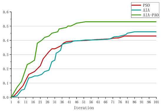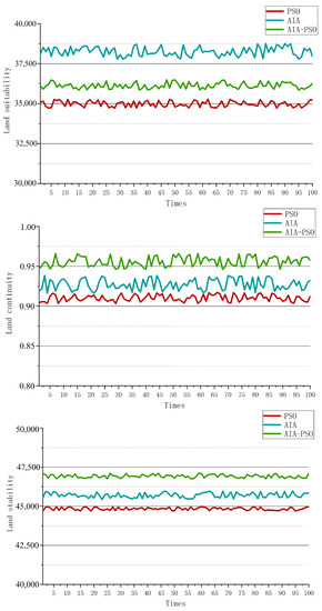 According to the above calculation results, compared with the average value, the three subobjective function values of the AIA-PSO model were higher than those of the PSO, which indicates that the addition of immune system concepts strengthens the global search ability of the original algorithm, and the optimization ability was better. However, it can be seen from the standard deviations that those of the AIA and AIA-PSO were higher than that of PSO, indicating that the two models were more volatile and that the algorithm was less stable than PSO. From the result curve drawn in Figure 9, we can see more clearly that the stabilization ability of the AIA-PSO model was less effective at solving basic farmland delineation problems than PSO but was more effective than the AIA. The addition of immune operations improved the problem of the PSO falling into a local optimal solution but reduced the stability of the model. Although AIA’s optimization ability was higher than that of PSO, the stability of the model is also an important indicator that cannot be ignored when solving multi-objective problems. The AIA-PSO model combined the stability of the PSO and the global search ability of the AIA and can obtain more satisfactory calculation results.