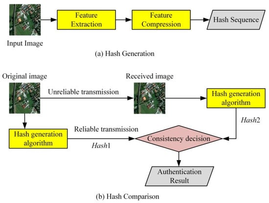 HRRS images have similarities with digital images in data organization, so the successful experiences of image perceptual hash cannot be ignored. For digital images, the procedure of perceptual hashing is shown in Figure 1, which consists of hash generation and hash comparison [30]. Figure 1a shows the procedure of hash generation, which consists of feature extraction and feature compression: the two-dimensional image is mapped to a one-dimensional array, and the robustness information is extracted to form the hash sequence. Figure 1b shows the procedure of hash comparison: the hash sequence is transmitted by a reliable channel, and the image may be tampered during the transmission. The receiver uses the same algorithm as the sender to generate a hash sequence Hash2 of the image to be authenticated and performs hash comparison with the original hash Hash1 to generate the authentication result.