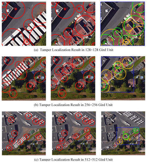 In this experiment, the tamper localization results of three tampered grid units are shown. The key points matching method described above is implemented to localize the tampered area. As shown in Figure 10, the tampered areas in these grid units were found and identified. This shows that the tampering localization method we designed can provide a relatively accurate tampering positioning results while maintaining the abstraction of hash sequence. In essence, if a large number of key points are selected, the tampered area can be depicted more accurately. However, due to the requirements of hash abstraction, a relatively reasonable result can still be obtained by using only 10 key points.