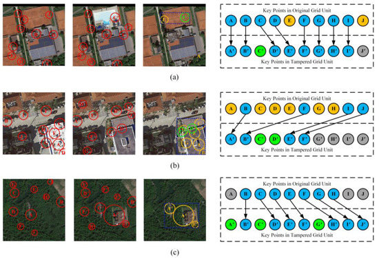 Tamper localization tests in grid unit: (a), (b) and (c) represents the key point matching and tamper localization process in three tampered grid units.