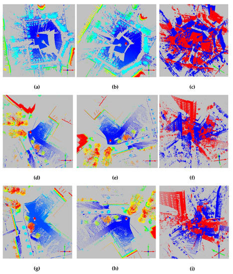 Point clouds of DRIEGL, DTRIMBLE-1 and DTRIMBLE-2: (a) target points of DRIEGL; (b) source points of DRIEGL; (c) points before registration of DRIEGL; (d) target points of DTRIMBLE-1; (e) source points of DTRIMBLE-1; (f) points before registration of DTRIMBLE-1; (g) target points of DTRIMBLE-2; (h) source points of DTRIMBLE-2; and (i) points before registration of DTRIMBLE-2. In (c), (f) and (i), source points are colored in blue and target points are colored in red.