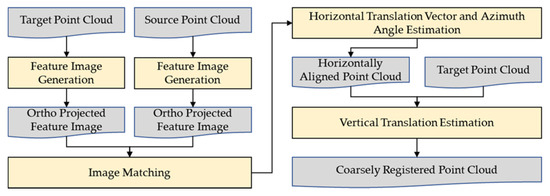 This paper takes full advantage of the fact that in many cases the TLS laser scanner is leveled and/or compensated by inclination sensors in terrestrial LiDAR scanning. Only the translation vector and azimuth angle are enough for coarse registration of such point clouds, and thus the degrees of freedom are reduced from 6 to 4. Figure 3 shows the workflow of the proposed 4DOF coarse registration method. To improve coarse registration efficiency, the 4DOF coarse registration is decomposed into two steps: (1) the estimation of horizontal translation vector and azimuth angle ; and (2) the estimation of vertical translation . The estimation of the horizontal translation vector and the azimuth angle is achieved by the registration of generated ortho projected feature images, which is described in detail in Section 2.2.1 and Section 2.2.2. The vertical translation is estimated by the height differences of the source points and the target points in overlapping regions after being horizontally aligned, which is described in detail in Section 2.2.3.
