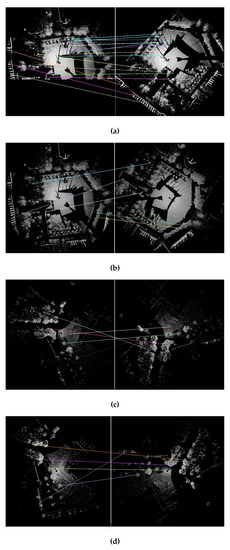 SIFT features are then extracted from the generated ortho projected feature images and matched by nearest neighbor algorithm. Figure 4 shows the generated ortho feature images and the SIFT matching results. In Figure 4a–d, the left parts are the ortho projected feature images generated from target points, and the right parts are the ortho projected feature images generated from source points. Different objects, such as squares, buildings, and trees, can be clearly distinguished in the feature images. The matched keypoint correspondences are connected by a color line. A total of 1484 correspondences were matched for DSimRIEGL. To illustrate the SIFT matching results more clearly, only SIFT matching results with distance ratio smaller than 0.1 (16 pairs) are drawn in Figure 4a. A total of 65 correspondences, 251 correspondences, and 23 correspondences were matched for DRIEGL, DTRIMBLE-1, and DTRIMBLE-2, respectively. To show the correspondences more clearly, only five representative correspondences were chosen and drawn in Figure 4b–d. The matched correspondences in DRIEGL, DTRIMBLE-1 and DTRIMBLE-2 are much less than that of DSimRIEGL, which indicates that viewpoint changes and occlusion in TLS scanning will affect the SIFT matching result. But the results indicate that enough correct correspondences can be found from ortho projected feature images generated from both simulated and real captured TLS point clouds to accomplish 4DOF registration.
