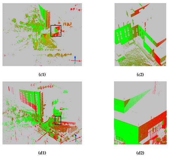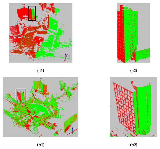 After enough correspondences were found from the ortho projected feature images, the horizontal translation vector and the azimuth angle were estimated using the matched correspondences. Then, the source points were horizontally aligned to the target points using the estimated horizontal translation vector and azimuth angle. The vertical translation was then estimated by the height difference of the source points and target points in overlapping regions after being horizontally aligned. Figure 5 shows the registration results of DSimRIEGL, DRIEGL, DTRIMBLE-1, and DTRIMBLE-2. Figure 5a1,b1,c1,d1 shows the overviews of the registration result of DSimRIEGL, DRIEGL, DTRIMBLE-1, and DTRIMBLE-2, respectively. The target points are colored in red and the source points after registration are colored in green. It can be seen from Figure 5a1,b1,c1,d1 that the registered source points match the target points well, which indicates that the source points are visually well registered to the target points. To identify the registration results more precisely, a small part of the registration results of each dataset (labeled in the black box in Figure 5a1,b1,c1,d1) are zoomed in and shown in Figure 5a2,b2,c2,d2. It can be seen from Figure 5a2,b2,c2,d2 that the walls scanned from target points and source points match each other very well, which indicates that the source points are precisely registered to target points.